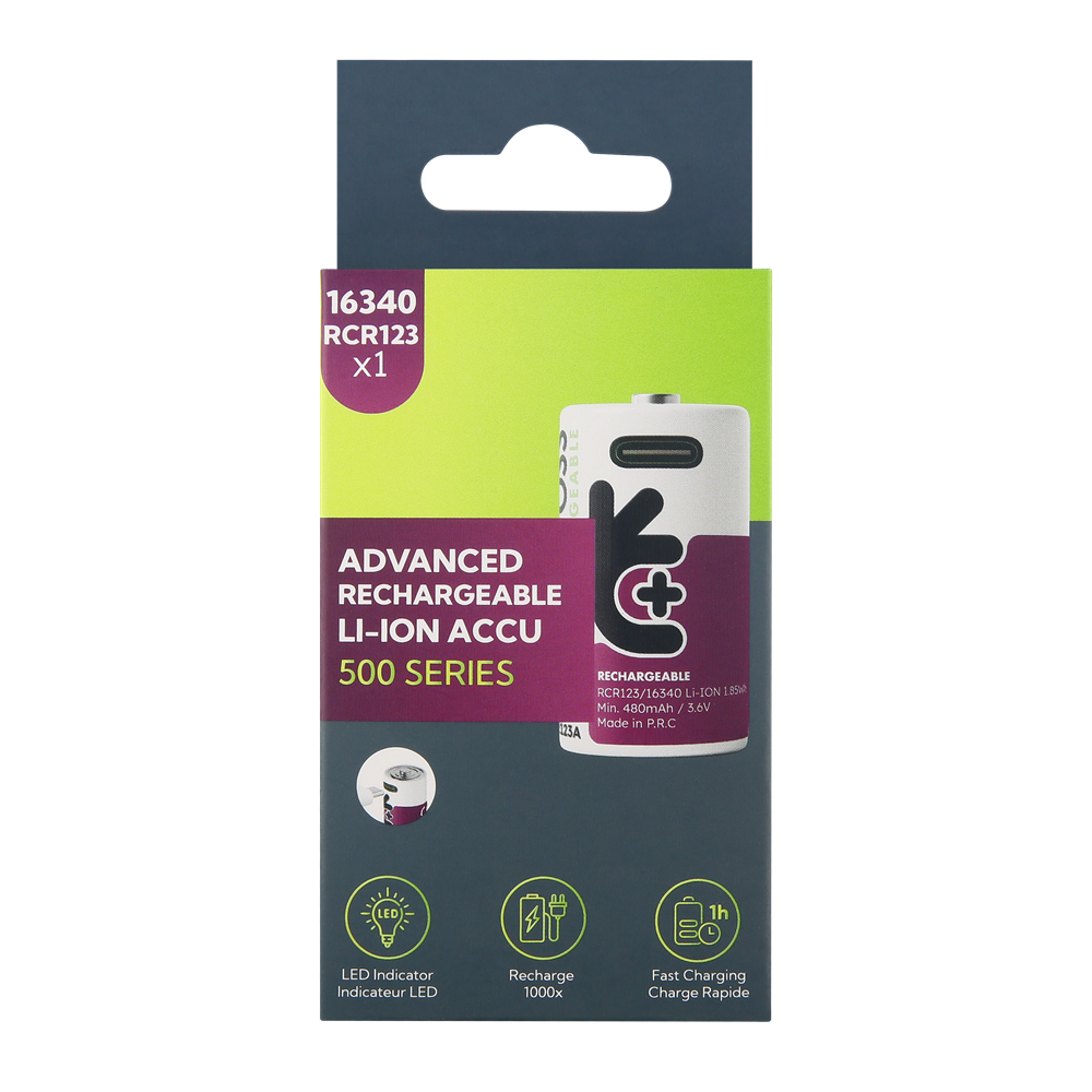 Uniross USB-C 3.7V Li-ion akkumulátor, RCR123, 34.5 mm, 500 mAh, 1 db/bliszter